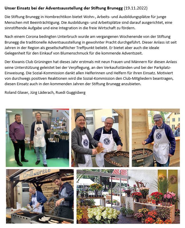 Auch im kommenden Jahr werden wir uns an zwei Anlässen für die Stiftung Brunegg engagieren. Fest eingetragen